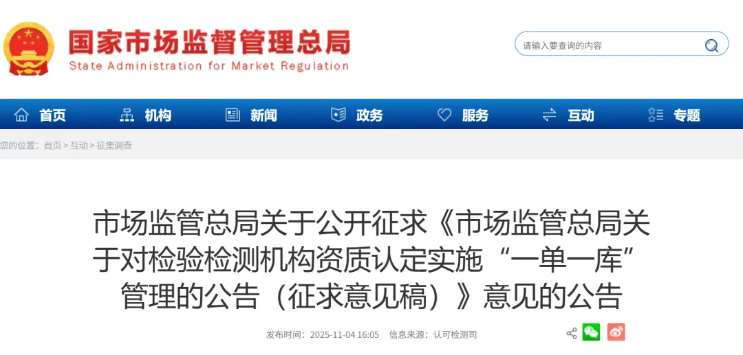 市场监管总局于今日(11 月 4 日)正式发布公告,就《关于对检验检测机构资质认定实施 “一单一库” 管理的公告(征求意见稿)》向社会公开征求意见,意见反馈截止至 2025 年 12 月 4 日。这一举措是深化检验检测机构资质认定制度改革的关键一步,旨在加快构建全国统一大市场,通过 “一单一库” 管理模式优化审批服务、强化依法行政。