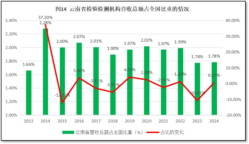 从图15可见,除了2014年之外,过去10年云南省检验检测机构营收总额在当地GDP中的占比增长不大,2021-2022年占比达到0.3%的高点后,2023年又下降到了0.28%,2024年维持在8%。除了2014年之外,云南省的数值一直比全国平均数要低,且近几年还有被全国平均数拉开差距的迹象。这说明云南省检验检测机构在云南省经济版图中的地位不高,其创造的价值与云南省的经济总量相比还很微小,最近几年这种情况还有所恶化。