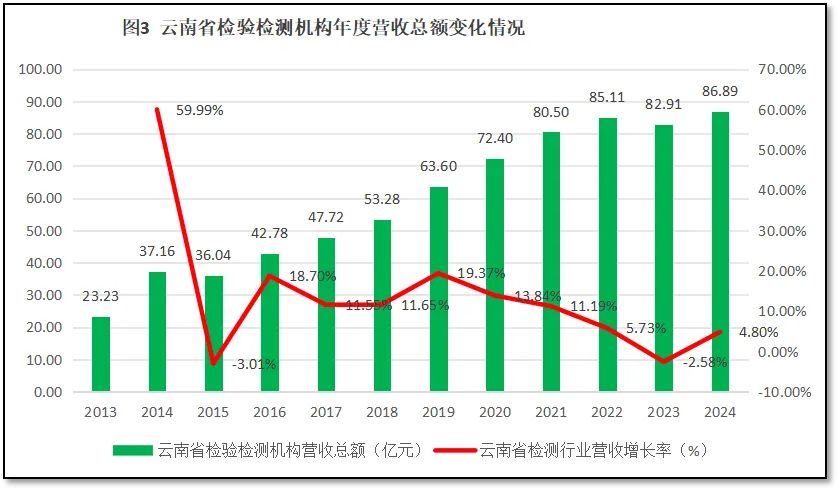 过去12年云南省检验检测机构年度营收总额的变化,如图3所示。