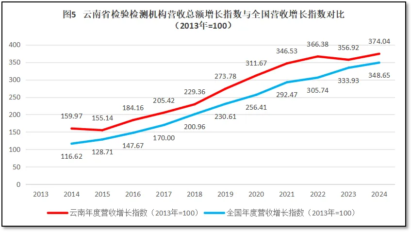 由上图可见,云南省检验检测机构营收总额增长指数一直保持着高于全国平均数的水平发展,曲线始终高于全国平均线,但高出并不多。且随着时间的推移,最近几年云南省检验检测机构营收总额增长指数还逐步减小了与全国平均数的差距,到2024年增长指数相差仅25左右,说明云南省检验检测行业发展质量一般,在过去12年中没有显示出特别大的发展优势。